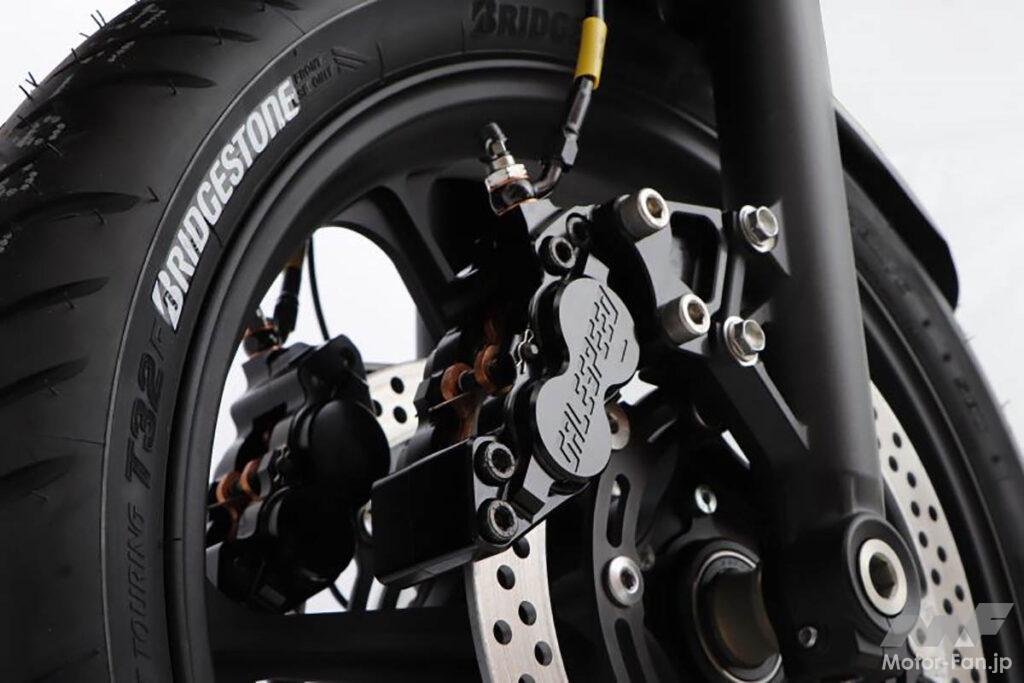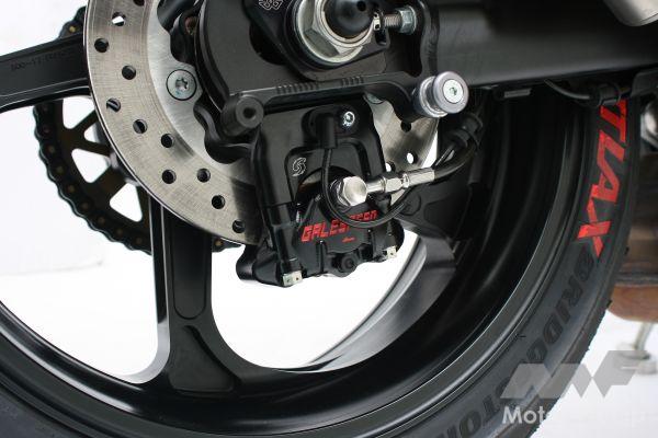 レーシーな「ラジアルマウント(縦置き)型」キャリパーは、ホイールの中心線に向かって垂直方向にボルト止め