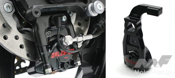 ボディを2ピース構造とすることで、内部を無駄なく切削。ディスクを挟み込むスペースを最小にしてピストン吐出量を抑え、ダイレクトなタッチを実現。リア用2POT(取付ピッチ84mm/カラーはシルバーとブラックあり/3万3000円)もラインナップ。