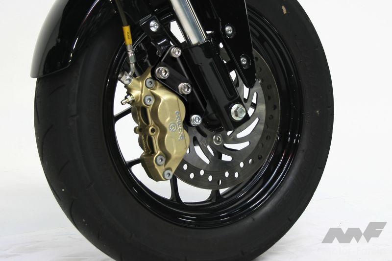 アキシャルマウント型キャリパーとはホイールの中心線に対し、平行(進行方向に向かって垂直)にボルトで固定された昔ながらのタイプ。レーサーやスーパースポーツモデルが上記のラジアルマウント型に移行したため、現在ではスタンダードなストリート向けのモデルに採用されている。