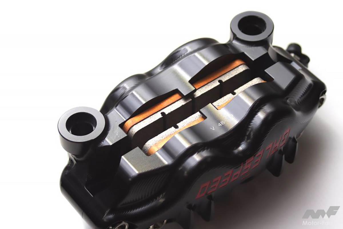 高性能・高剛性・高品質のラジアルマウント型キャリパー。「ストリートやスポーツ走行をメインステージとした、上質で精巧なアルミビレットキャリパー」をコンセプトに、ブランク材を3D切削加工。Elaborate(精巧な・技巧的な)の名に相応しい機能美溢れる性能に仕上げている。取り付けピッチ100mm版(フロント用 チタンボルト版:12万1000円/SCMボルト版:10万7800円)、リア用(2POT/取り付けピッチ60mm/チタンボルト版:7万400円/SCMボルト版:6万3800円)もあり。