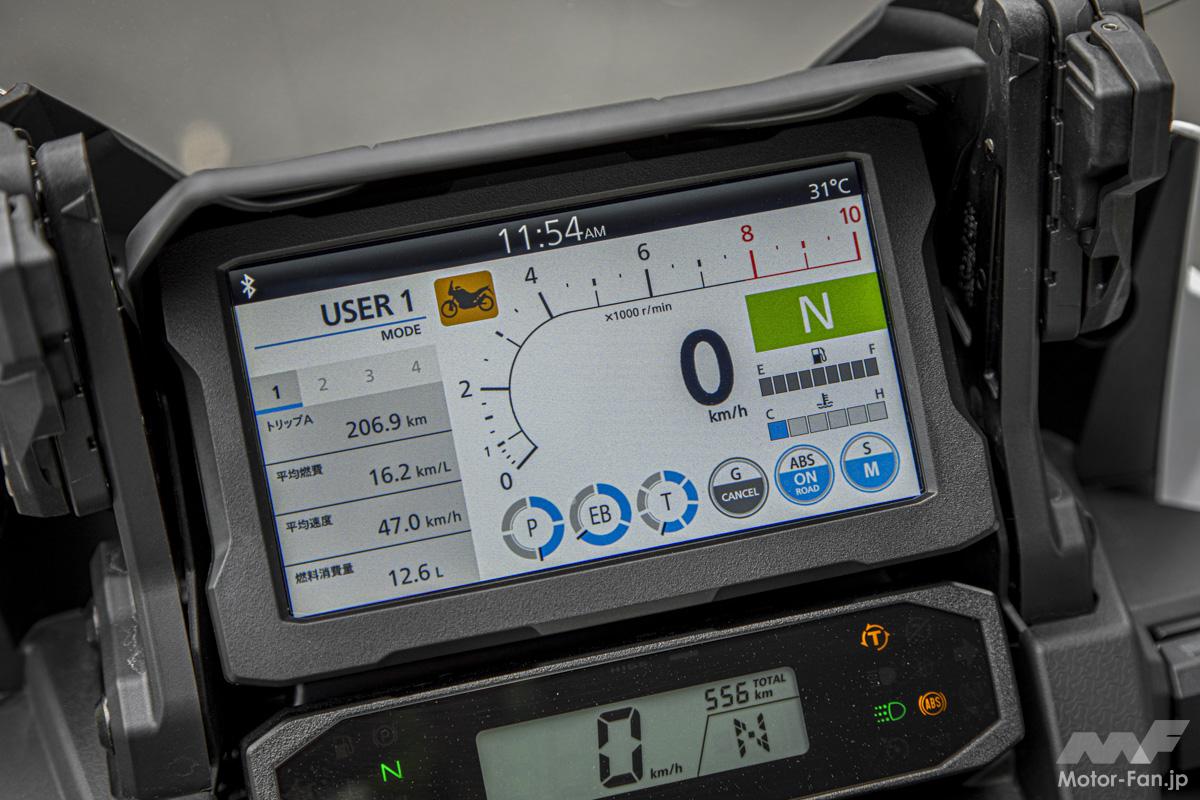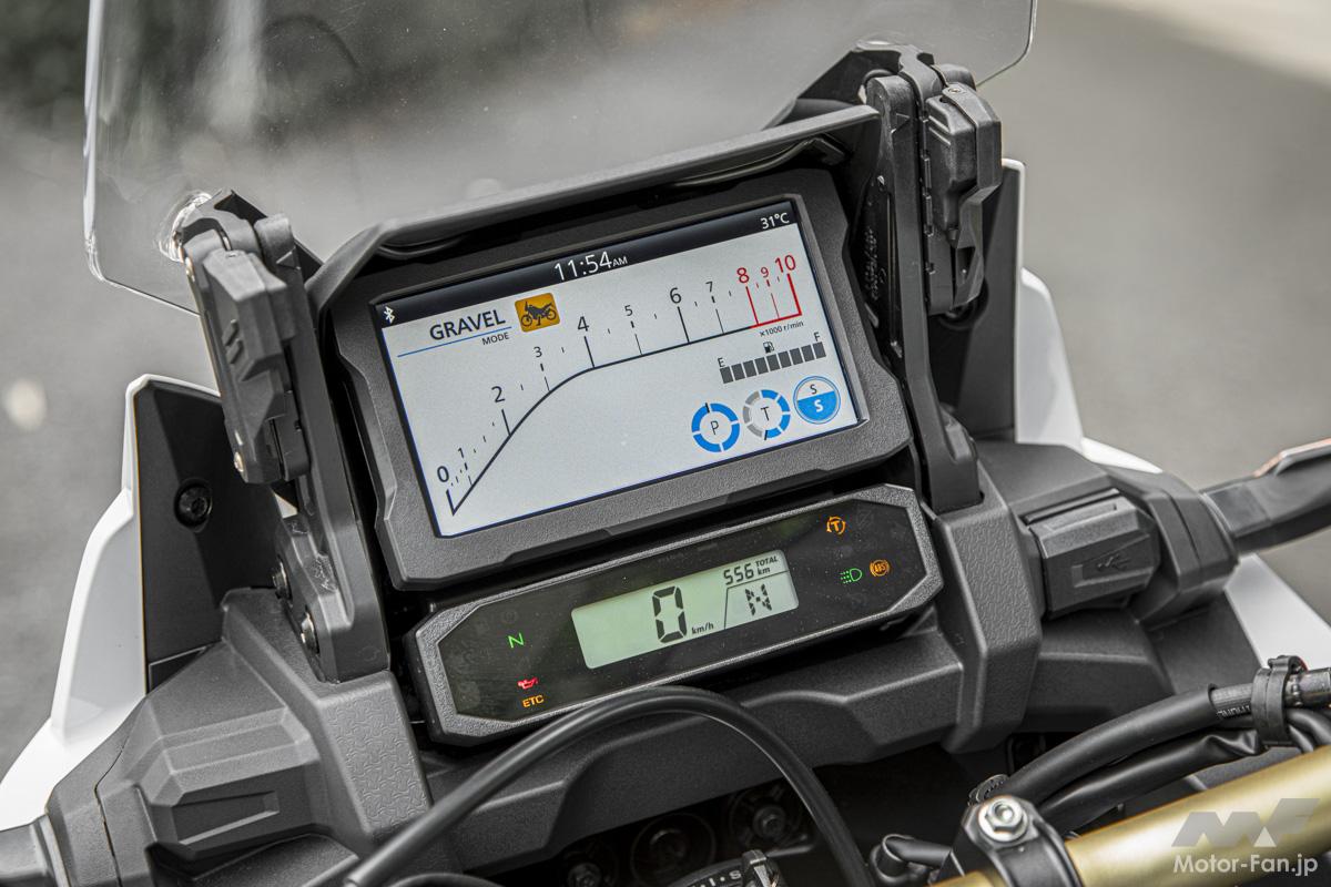 このエンジンの魅力を引き出しているのがDCTである。アフリカツインでDCTを選ぶユーザーが多いことは知られている。今回のモデルでは発進や1速から2速への変速がより自然になるなどの改良が加えられ、より完成度が高められている。