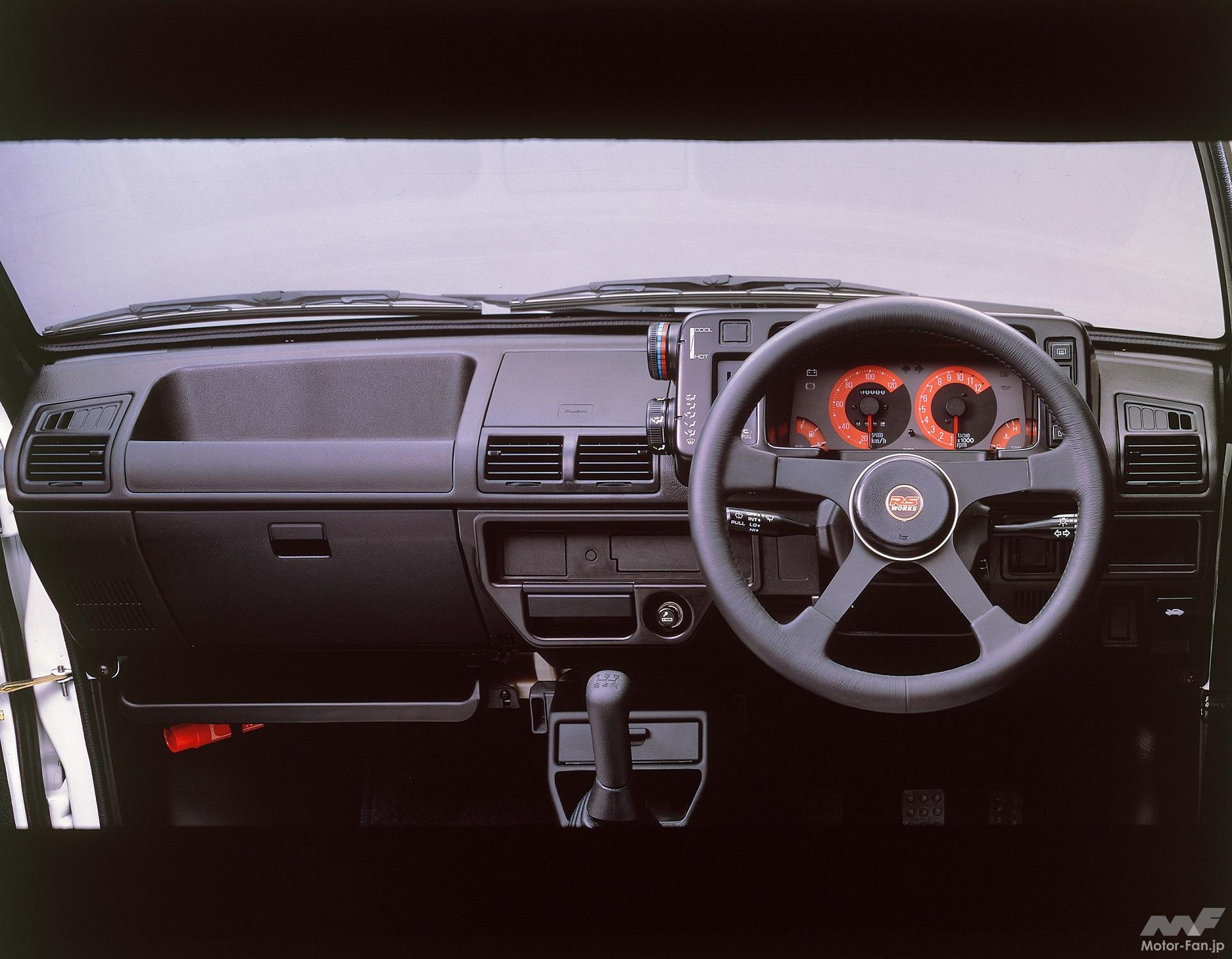 小径ハンドルと、左右非対称形状のバケットシート、と内装でも運動性能を誇示する。メーターはゼロ点が真下にあり、真上が1万回転・100km/h。タコメーターの表示はMAX1万2000rpm。まさに新ジャンルカーの初代だが、力をつけたミラTR-XXの姿がミラーに映る。ミニカの最強化も観測。