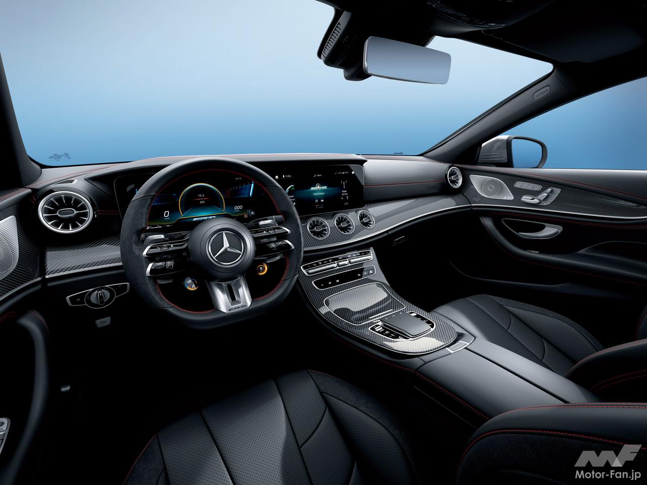 トップパフォーマンスモデル「メルセデスAMG CLS 53 4MATIC+」は、縦にルーバーの入ったAMG専用グリルが採用され、ワイド感あるバンパーとともに、スポーティな印象をよりいっそう強めている。新しく設定された「カーボンパッケージ」では、ドアミラーやスポイラーリップ、トリム等がカーボンに変更され、レッドブレーキキャリパー、マットブラックペイントの20インチAMG 5ツインスポークホイールが装着される。AMGダイナミックセレクトには「レース」モードが追加された。