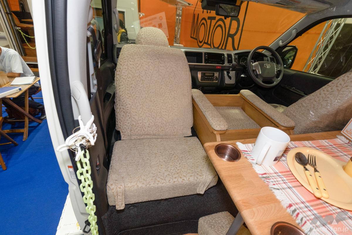 欧州製キャンパーだと、運転席と助手席が回転対座するモデルは一般的だが、国産車では数少ない。しかも、ハイエースは回転させるだけの空間がないから、シートバックを前方に倒すだけでいいのである。これは簡単だ。ちなみに、ブルームーンは4名就寝となる。
