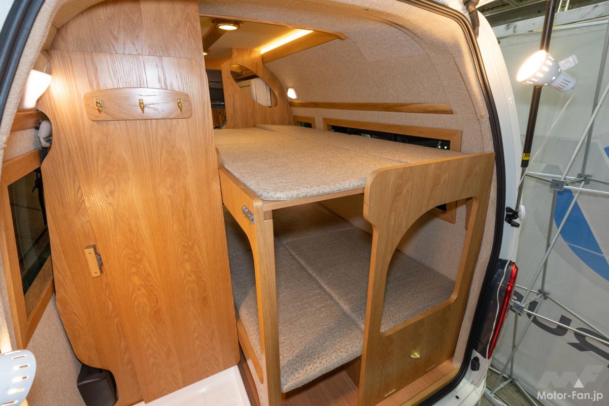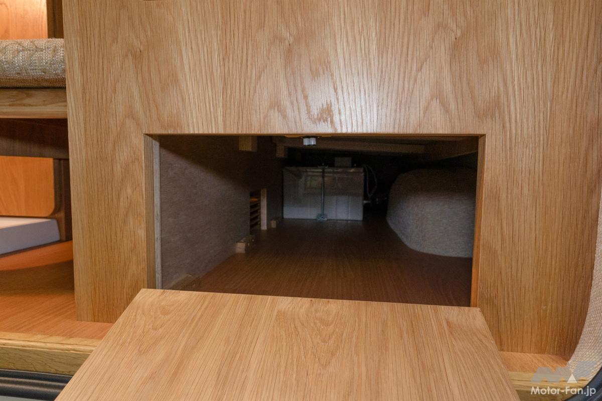 木目調の家具も、実に質感がいい。嫌みのない色合いで、国産車よりも欧州車に近い感じがする。オーバルや角丸の開口部など、デザイン的にも国産車ではなかなかお目にかからない。さらに、セカンドシートのクッション、ベッドマットのトリムもシンプルモダンなものを採用している。
