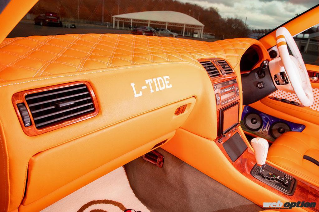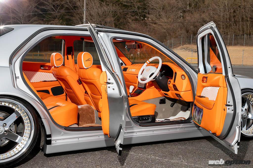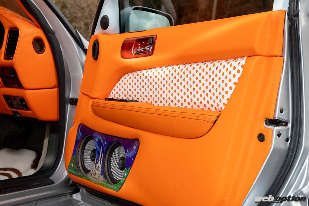 落ち着いた印象のエクステリアとは対照的に、インテリアは超ド派手な仕上がり。オーナーはメインカラーにオレンジを選んだ後、差し色となるホワイトは多くても3割程度になるように配慮。その比率を守るため、シートベルトなどの小物もオレンジカラーの製品に巻き直されている。