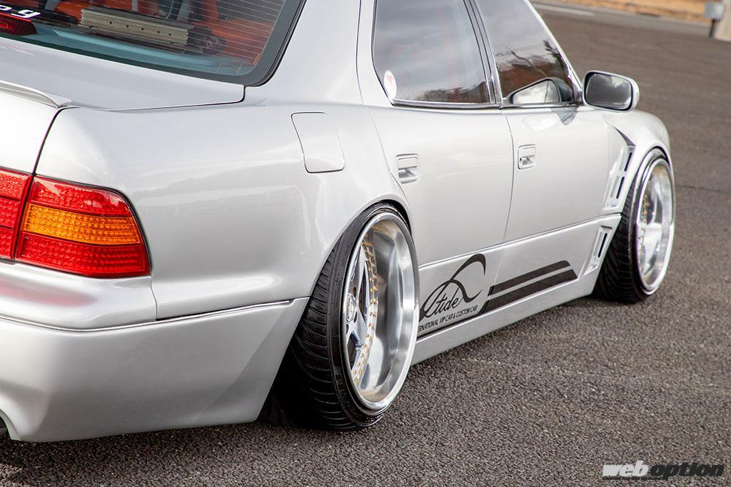 「外装はメーカーを揃えてしまうと他人と被りやすい」との理由から、ブランドには拘らずにオーナー自身の感性でセレクト。フロントとリヤはオートクチュール製で、サイドステップはオブラクション製のエアロを短縮加工して装着。腹下まわりもクリアランス対策が施されているため、接地レベルのシャコタンでも問題なく走行可能となっている。