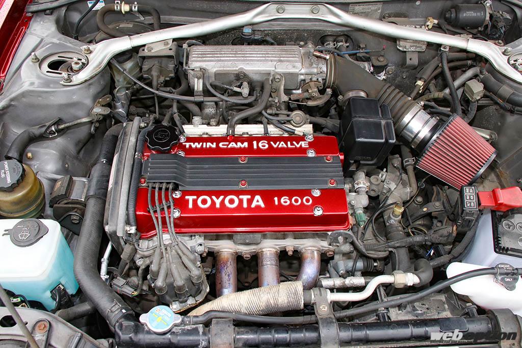 名機4A-Gエンジンは、オーバーホールの際にヘッドガスケットをTRDのメタルタイプに変更。タコ足はタナベでマフラーは自作のワンオフ品。スポーツタイプのエアクリーナーは汎用品をネットで調達して製作したものだ。