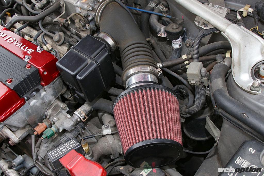 完全なノーマル状態からコツコツ仕上げたマシンは走りの雰囲気が漂うが、チューニングにあたっては専用パーツが皆無に等しいため他車種用を流用。美しいレッドマイカカラーのボディは、純正色でオールペンを施したものだ。