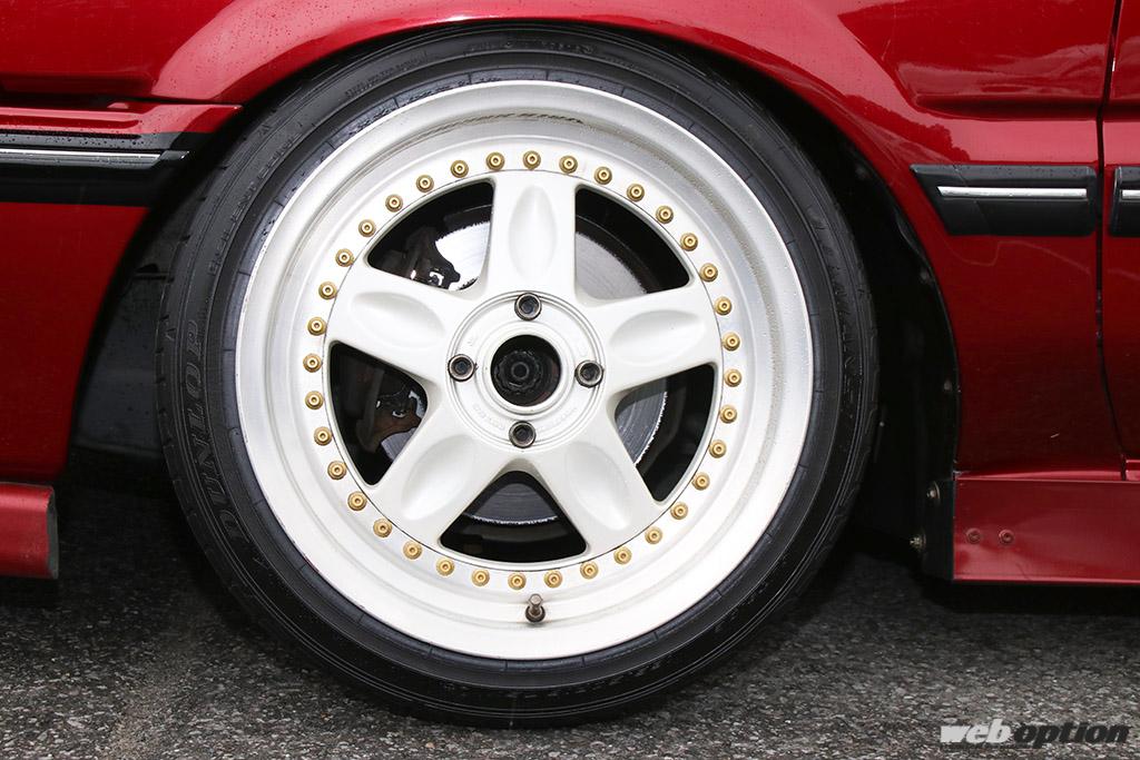 マッシブな5本スポークデザインは、当時人気を集めていた通称グループCレース(全日本スポーツプロトタイプカー耐久選手権)マシンに採用されていたもので、軽量化のためにスポークに設けられた卵形のディンプルが特徴となっている。林さんのAE92セダンが装着しているのは前後とも8.0J+50×16インチの3ピースタイプで、ワイドトレッドスペーサーの追加によりツライチスタイルを実現している。