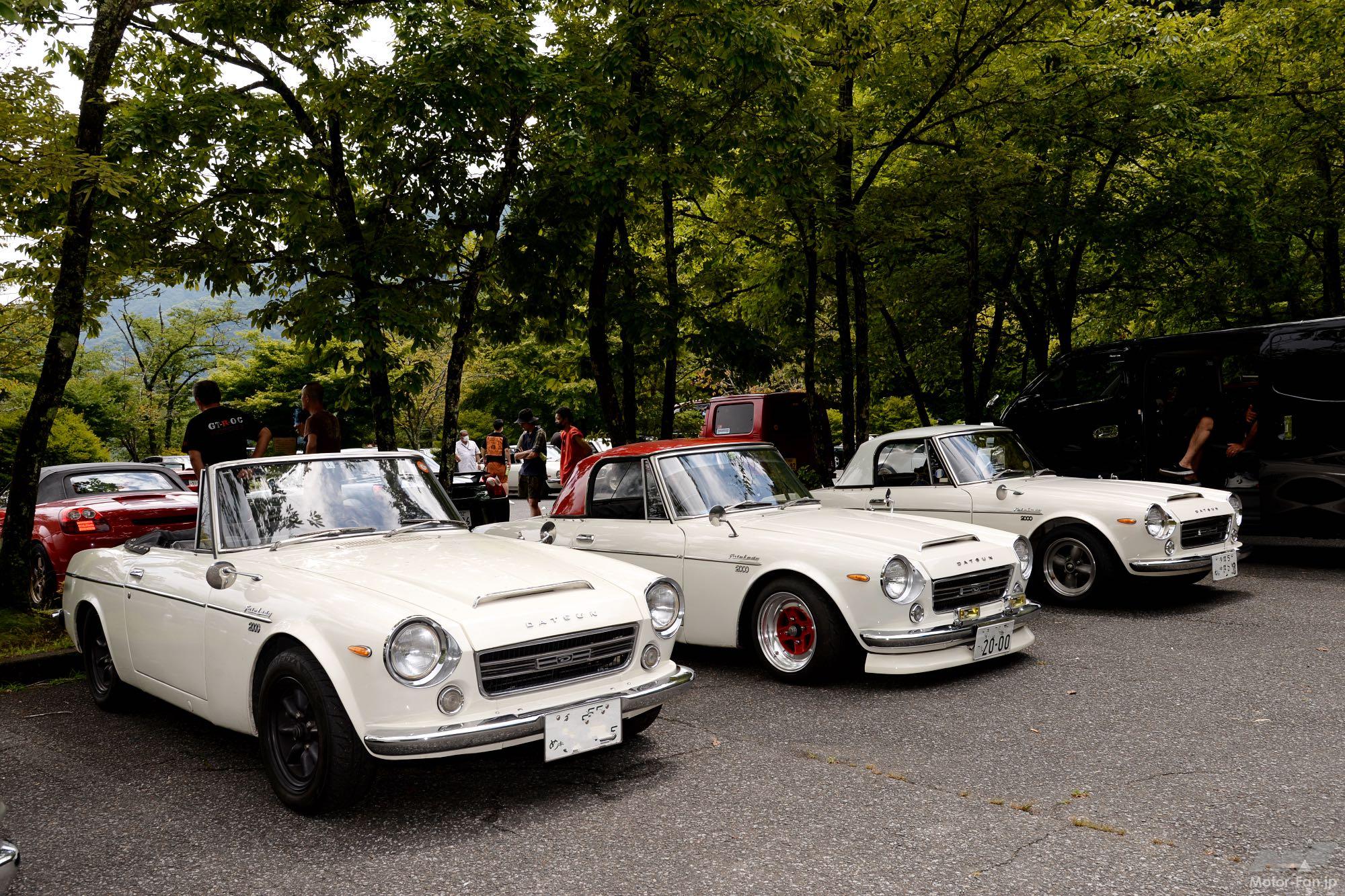 天気が回復してきた頃、勇ましい排気音とともに現れたのがZを名乗る前のフェアレディ、ダットサン・フェアレディ2000たち。3台ともナンバーから(画像は処理済み)奥多摩に近いオーナーたちのようで、雨が残る早朝を避けて駆けつけたのだろう。この日の駐車場は空いていたため、難なく3台並べることができたようだ。同じモデルとはいえ3台ともアルミホイールが違い、2台にはハードトップが装着されていたが色分けを変えるなど個性を演出していた。