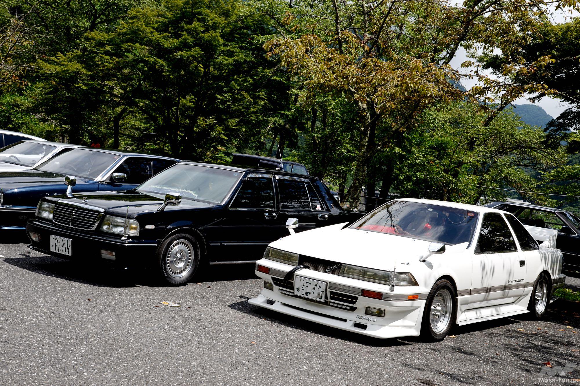 事前エントリー制のイベントだと派手な改造車は参加を断られることが多く、会場の周囲を走り回る姿が見受けられるもの。ところが東京旧車会には縛りがないため、時に画像のソアラのように派手なカスタムが施されたクルマも会場へやってくる。それとは別にフェンダーミラー姿で覆面風なセダン、Y31セドリックなどもやってくるから面白いもの。全く相容れないように思える2台だが、このソアラはさりげなくフェンダーミラー仕様にされている。こんな視点で居並ぶ旧車を見ると新たな発見があるかもしれない。
