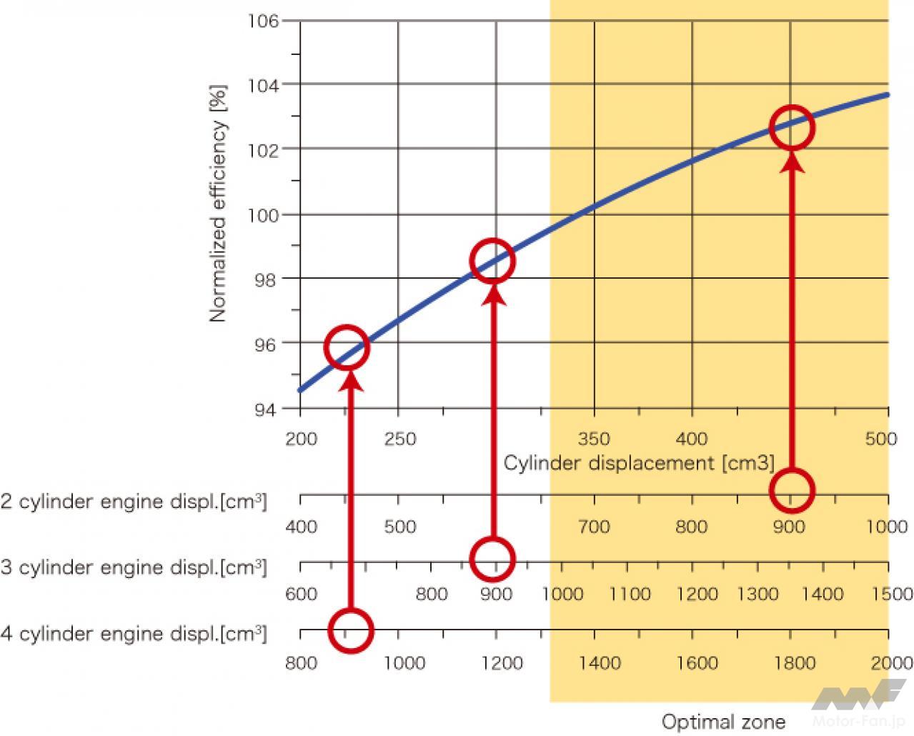 そこでシリンダー数である。2気筒か3気筒か4気筒か。というより、既存技術を転用できる点などから、4気筒、3気筒、2気筒の優先順位で取捨選択が始まったことだろう。燃費、コスト、NVH、パフォーマンスの4項目をバランス良く成立させるシリンダー数はどれか、と。