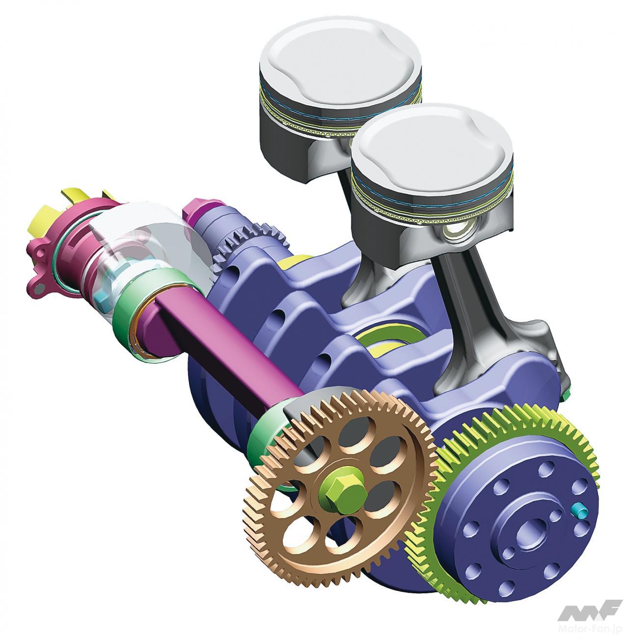 排気量が同じなら、単気筒容積を大きくしつつスモールボアにすると、S/V比(燃焼室の容積に対する表面積の比率)が小さくなって冷却損失が減る。ピストンの数を少なくすれば、それにともなって軸受やバルブの数も少なくて済み、フリクションが減る。熱効率の面から4気筒を切り落とし、3気筒と2気筒の一騎打ちで比較してみると、2気筒は全長が短くできるので、A/Bセグメントのクルマに横置き搭載するには都合がいい。既存の3気筒エンジンのほとんどがバランサーシャフトを備えていないが、2気筒は必須。その点を勘案してもムービングパーツ類の点数は3気筒の3分の2になるしで、2気筒にコストメリットがある。