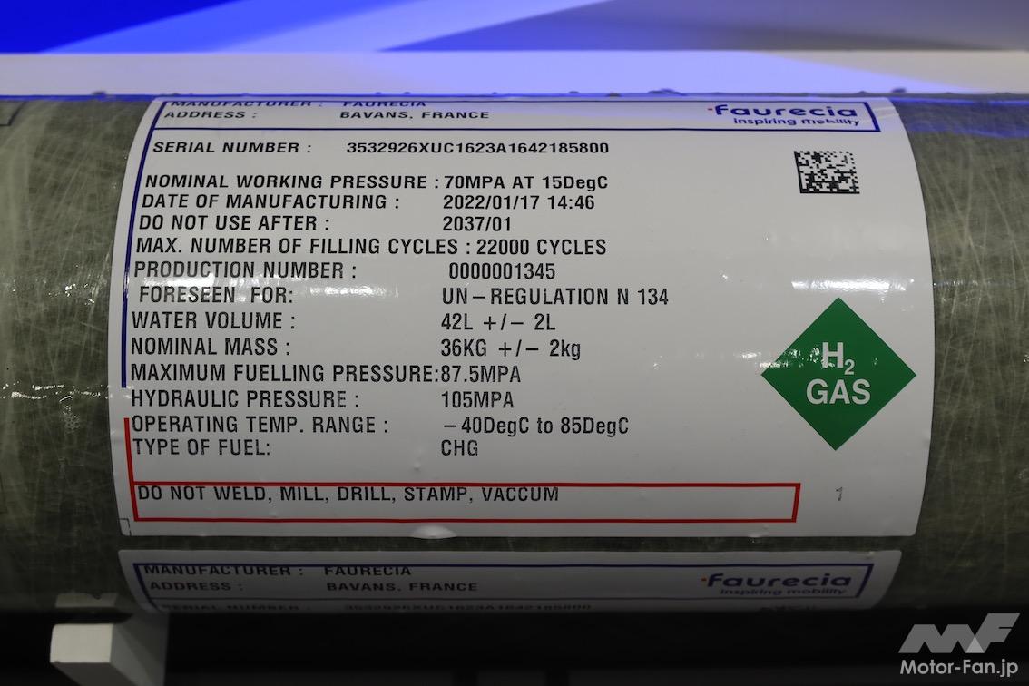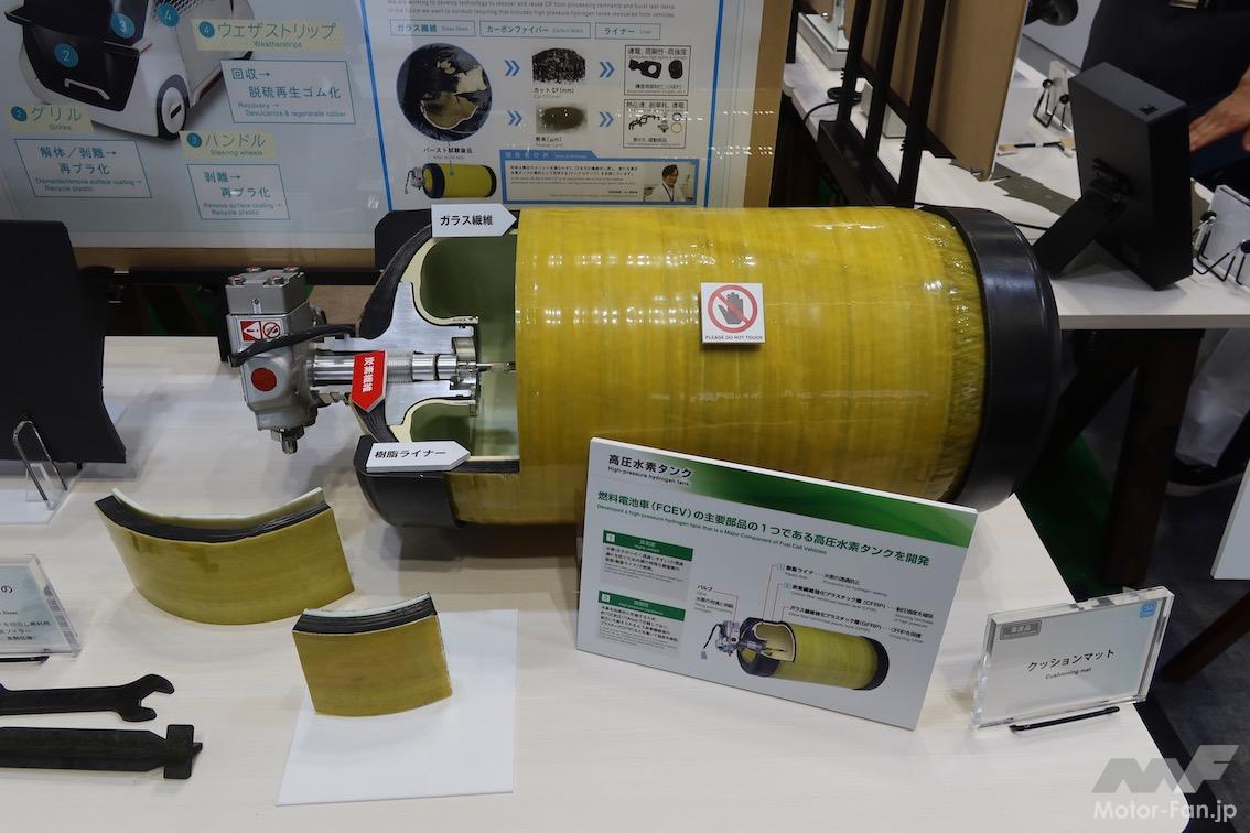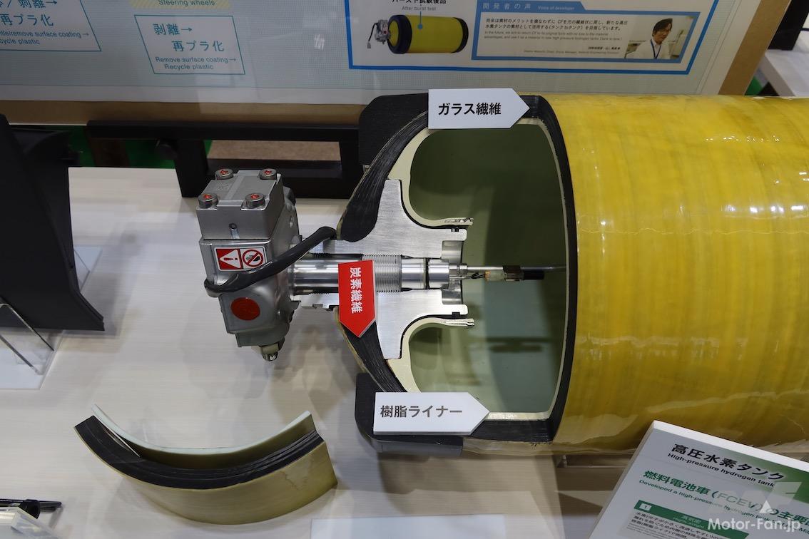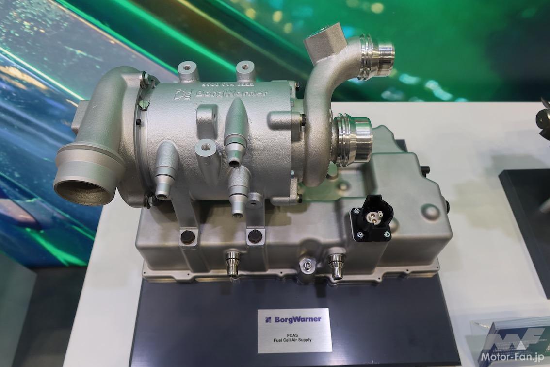 フォルシアは「小型商用車(ワゴン車)向け水素貯蔵システム」として、70MPaの高圧水素タンク(容量42L)を展示。ボルグワーナーには、燃料電池に空気を送り込むコンプレッサー(Fuel Cell Air Supply Compressor)が展示してあった。