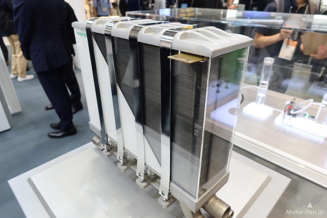 OEMもサプライヤーも燃料電池や水素エンジンに特化した技術に展示物を絞っていたわけではない。モーターと何かを組み合わせたり、バッテリーに関連したりする電動化技術は、今回の『人テク展』のいっぽうの花形ではあった。シェフラーも同様。電動アクスルなど、電動化に関するソリューション技術を展示するいっぽうで、数ある技術のひとつとして燃料電池スタックを展示していた。燃料電池のセルにはスチールを使う。そこに、「ベアリングなど、自動車エンジン部品で培ってきた技術を生かせる」と説明する。
