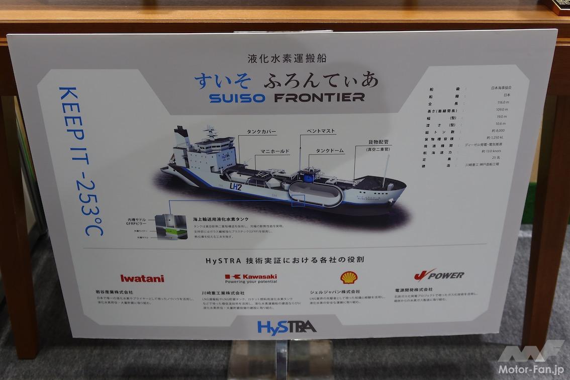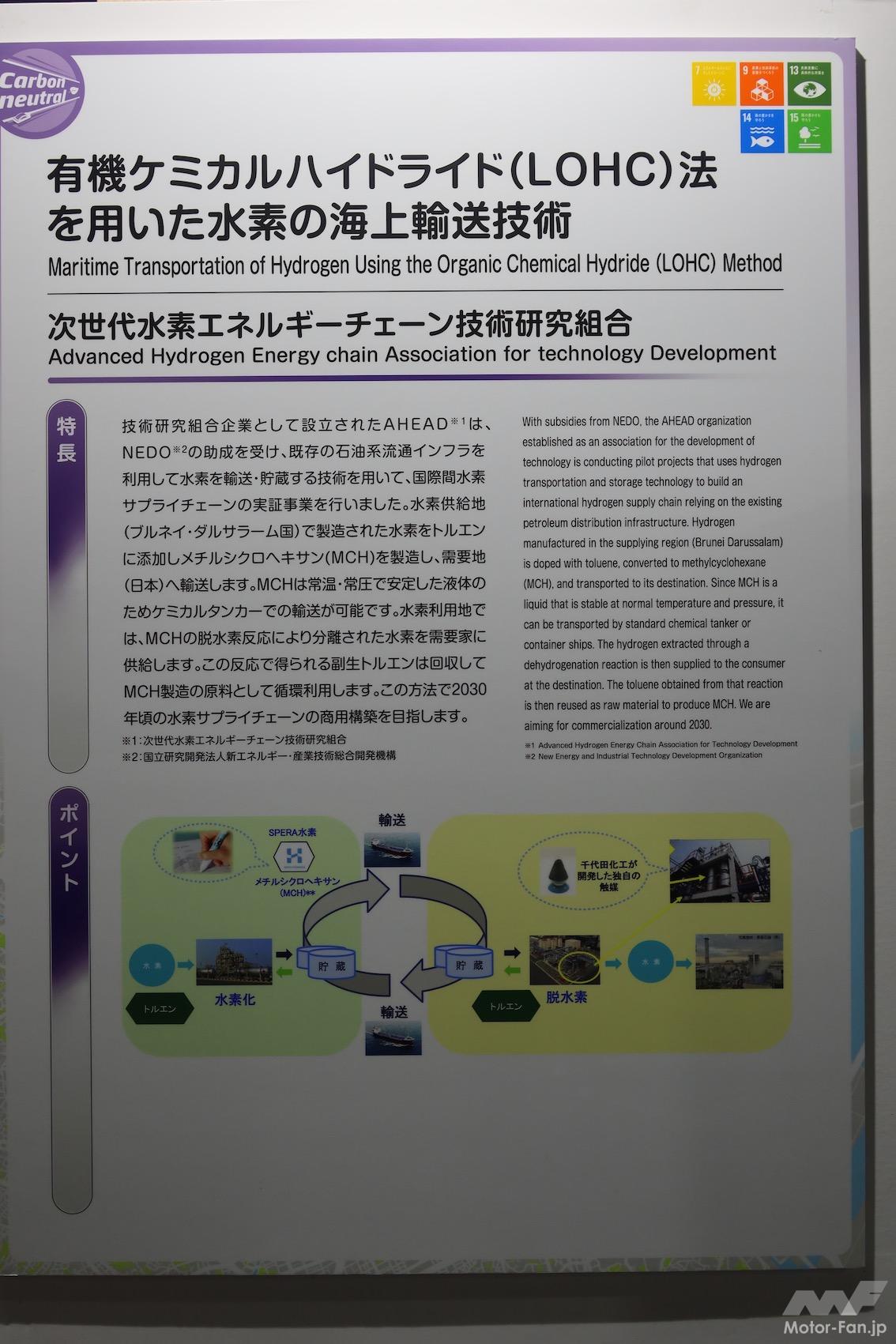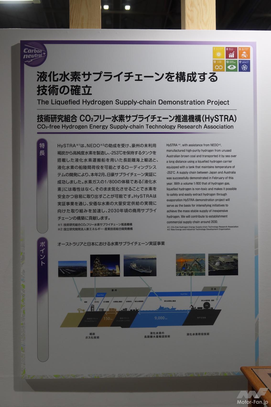 となると、やはり電気か。いやいや、どっちに転ぶかは誰にもわからない。どこに向かうにしても、いま持っている技術と、将来的に生き残る技術をつなぐ技術が存在するはず。特定の技術に的を絞る段階ではないが、水素が選択肢のひとつである可能性は高い。主催者企画展示はカーボンニュートラルへの道を「創・蓄・使」の観点で捉えた内容となっており、「蓄」のゾーンでは、海外にある未利用資源(例えば、オーストラリアの褐炭)を用いて水素を製造し、日本に輸送する水素サプライチェーンを構築する取り組みなどについての紹介が行なわれていた。水素を取り巻く動きは活発だ。