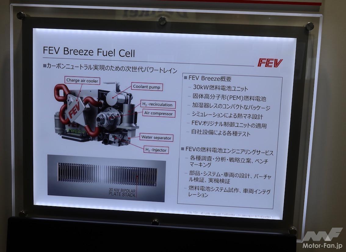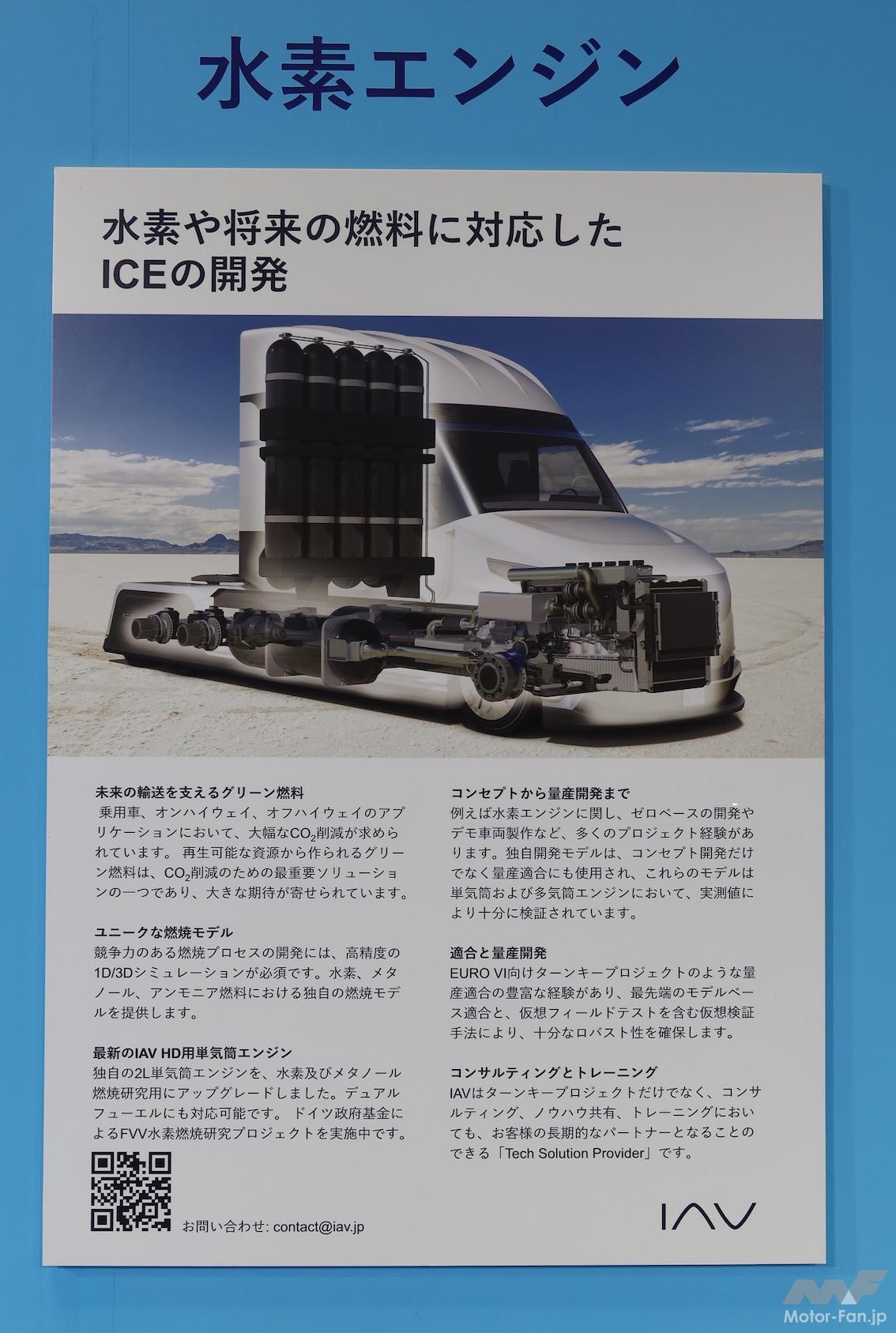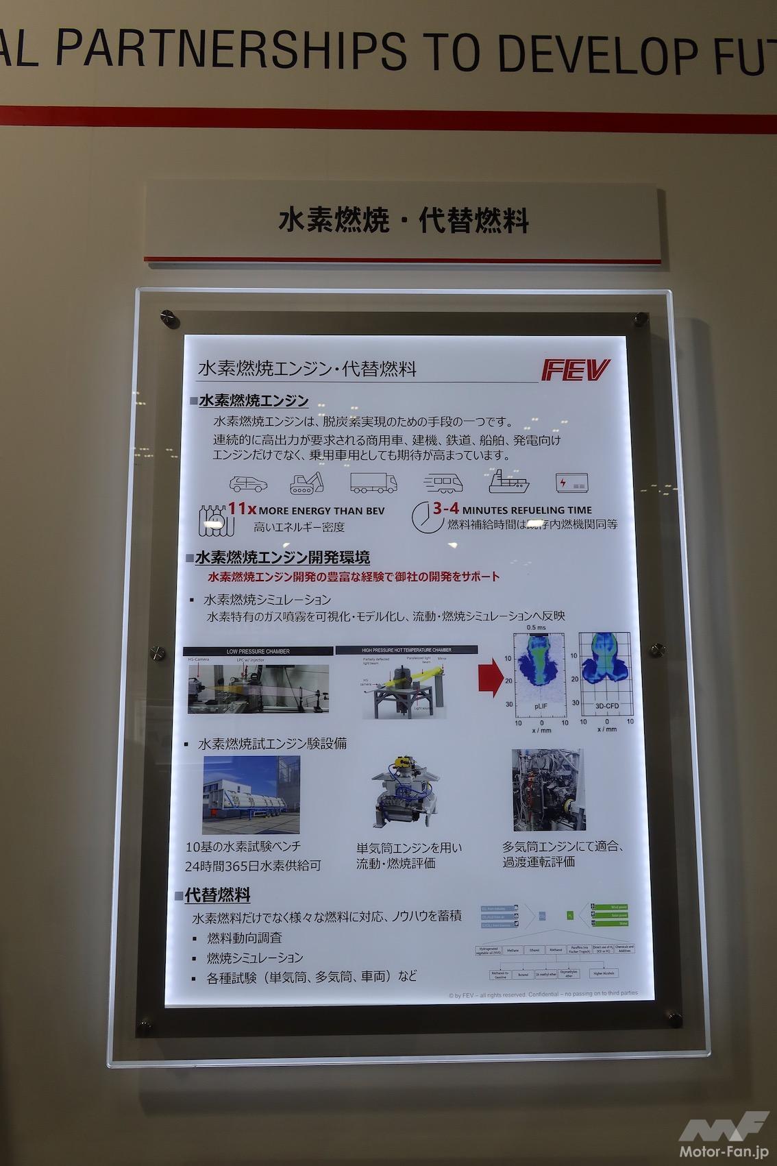 電動化が大きな流れになっているのは衆目の一致するところだ。だから当然、競争相手は多いし、少ないパイを奪い合う状況になりかねない。専門性の高いサプライヤーもあるため、後発でビジネスチャンスをつかむのは難しい。別の鉱脈として脚光を浴びつつあるのが、水素関連ということだろう。エンジニアリング企業の技術戦略に「選択と集中」はありえず、電動化と水素の両面で技術提案を進めている。FEVには水素エンジンと燃料電池ユニットが、IAVには水素エンジンが展示されていた。