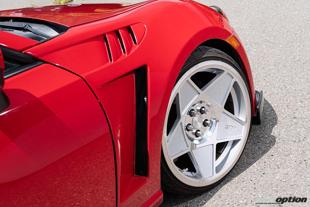 一方、フロントフェンダーにはイングス製をセレクト。スリットやアウトレットダクトの存在によって、視覚的にかなりのワイド仕様に見えるが、実際の拡大幅は10mmで車検対応というアイテムだ。ホイールは3SDMの0.05。サイズは9.5Jプラス35で、3mmのスペーサーを噛ませることによって絶妙なツライチ加減に仕上げている。