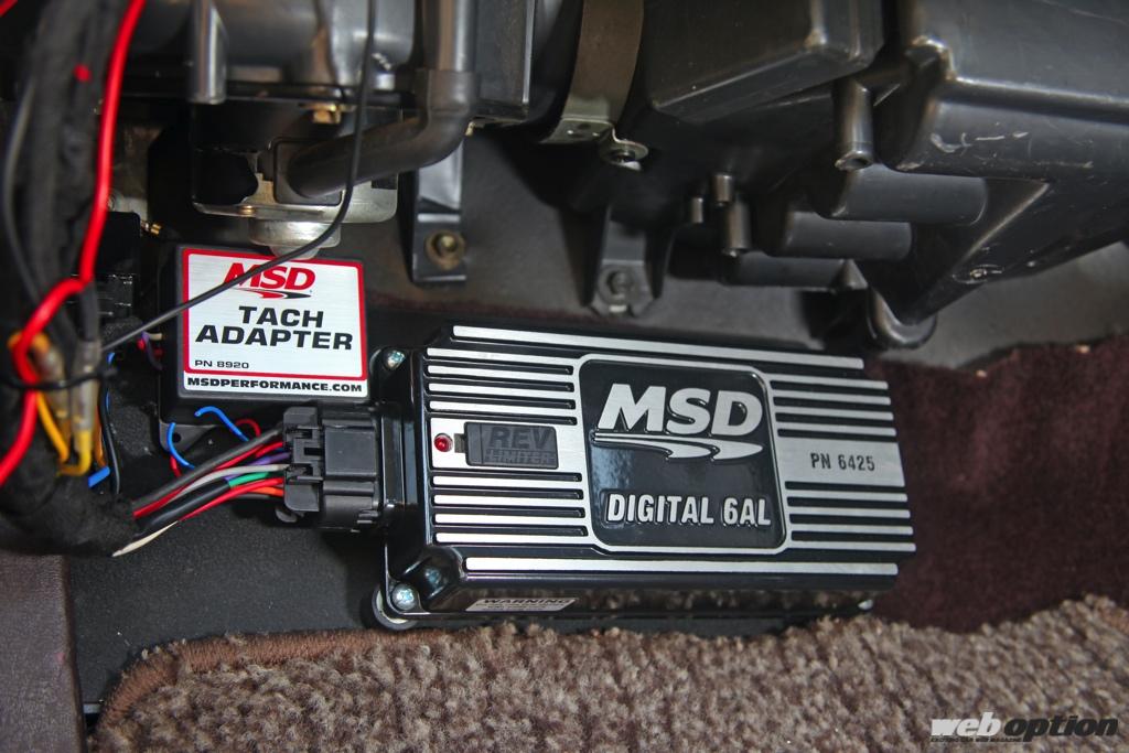 助手席の足元にセットされたMSDと回転信号を送るアダプター。現状、1万1000rpm付近から点火が追従しなくなる(失火症状が出る)ため、独自にCDIの開発が進められている。