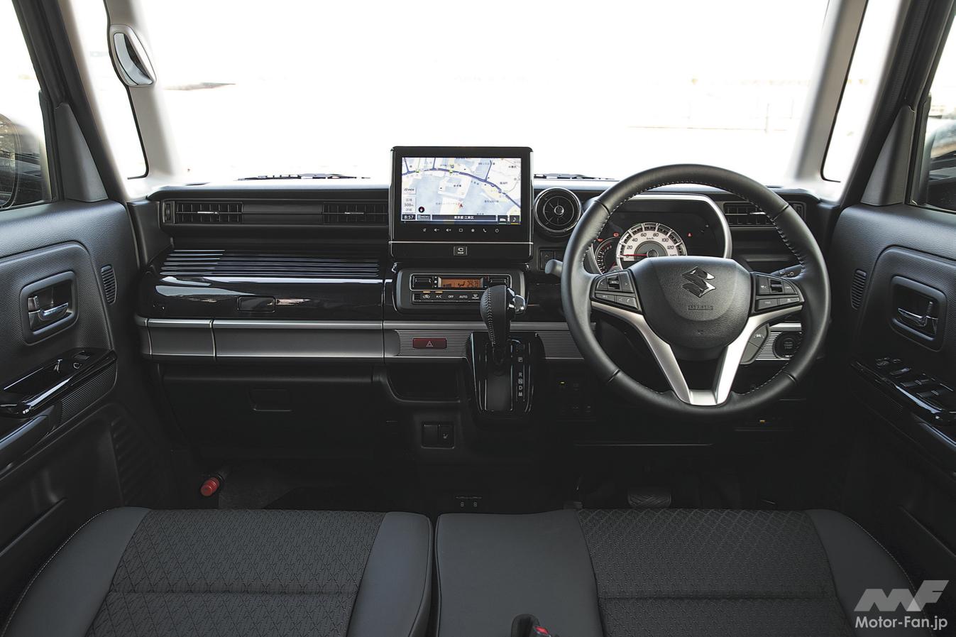 インテリアの質感も高く、助手席前のアッパーボックスをスーツケース風に仕上げるなど、ユニークなデザインも好評を得ている。助手席下にはスズキ車定番のアンダーボックスを備えるなど収納スペースが多いのも美点。N―BOXやタントのように前席のロングスライド機能はないが、助手席のバックレストを前倒しできるので長尺物を安定させた状態で積むことができる。