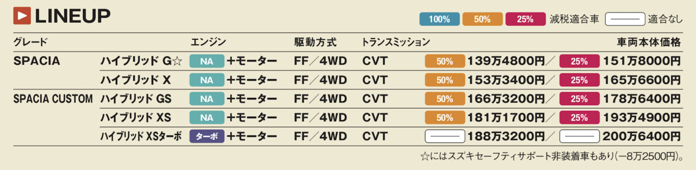 エンジンは標準が自然吸気しか選 べないが、カスタムにはターボも用意される。スペーシアはスーパーハイトワゴンの中では車両重量が軽く、微力ではあるがモーターアシストも効くマイルドハイブリッドなので自然吸気でも意外なほどスムーズに走ってくれる。CVTもむやみに高回転域を使わず、アクセル開度が低い領域では低回転で粘ってくれるから静粛性も高い。カスタムのターボエンジンなら、あらゆる領域で力強さが増すので、高速のロングドライブも楽にこなしてくれる。