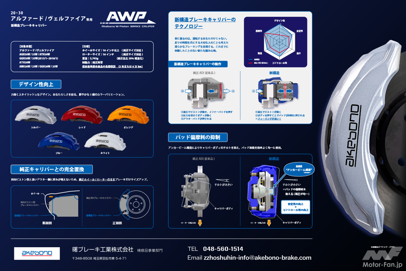 akebonoは、1978年に同社の独自技術を用いて開発したAD型ディスクブレーキ(フローティングタイプディスクブレーキ)や高性能車用ディスクブレーキ(対向型ディスクブレーキ)の開発で培った技術ノウハウをベースに、既存のAD型ディスクブレーキの構造を大幅に見直し、自動車の電動化への対応と地球環境保全に配慮した新タイプの「新構造ブレーキキャリパー」を世界で初めて開発し、2018年に発表した。その後、市場調査やテスト走行などを経て、2022年5月からの製品市販化に至った。