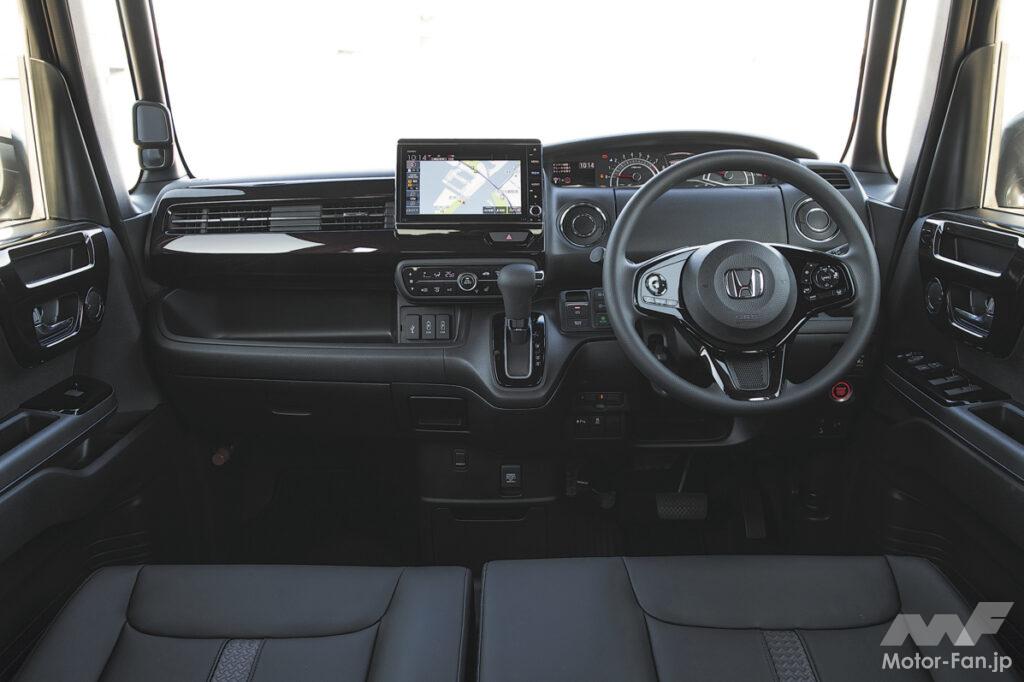 N-BOXには標準車とカスタムがある。後者は専用デザインのフロントマスクやエアロパーツにより、外観の存在感が強い。内装も上質だ。小型車と同等の質感が備わり、エアコンの吹き出し口などにメッキの装飾も施した。シート生地も上質で、ターボ車などには、標準車が採用しないプライムスムースも使われている。
