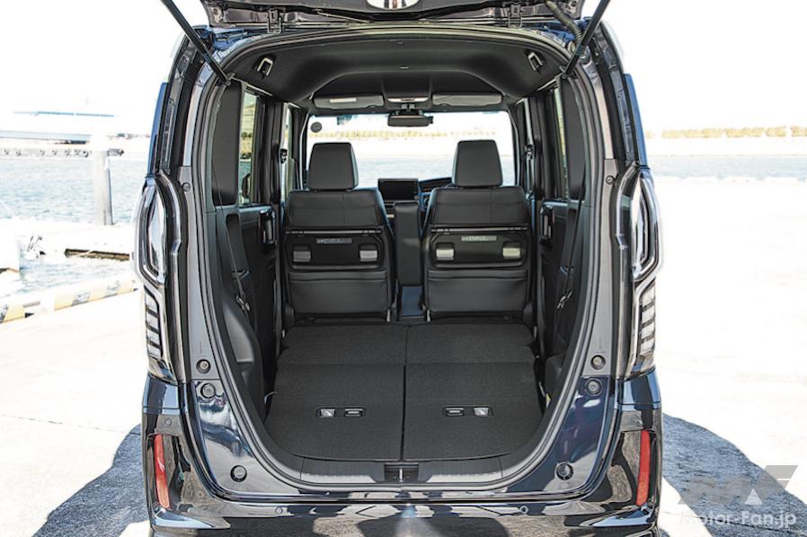 全高が1790mm(FF)、ホイールベースは軽自動車で最長の2520mmだから車内は広い。身長170cmの大人4名が乗車したとき、後席のスライド位置を後端まで寄せると、膝先空間は握りコブシ4つ分に達する。一般的にふたつ分でも十分に広いから、N-BOXの足元空間はタップリしている。ただし後席の座面は少し硬いので、柔軟性が欲しい。購入時には実際に座って確認したい。後席にチャイルドシートを装着したときは、前側にスライドさせると便利。間隔が縮まり、信号待ちなどに子どもの世話がしやすい。後席の後ろ側には十分な荷室が確保され、子ども用の自転車やベビーカーを積める。後席の背もたれを前側に倒すと大容量の荷室になり、路面から荷室床面までの高さは470mmと低い。大人用の自転車を積む際も、前輪を大きく持ち上げる必要はない。