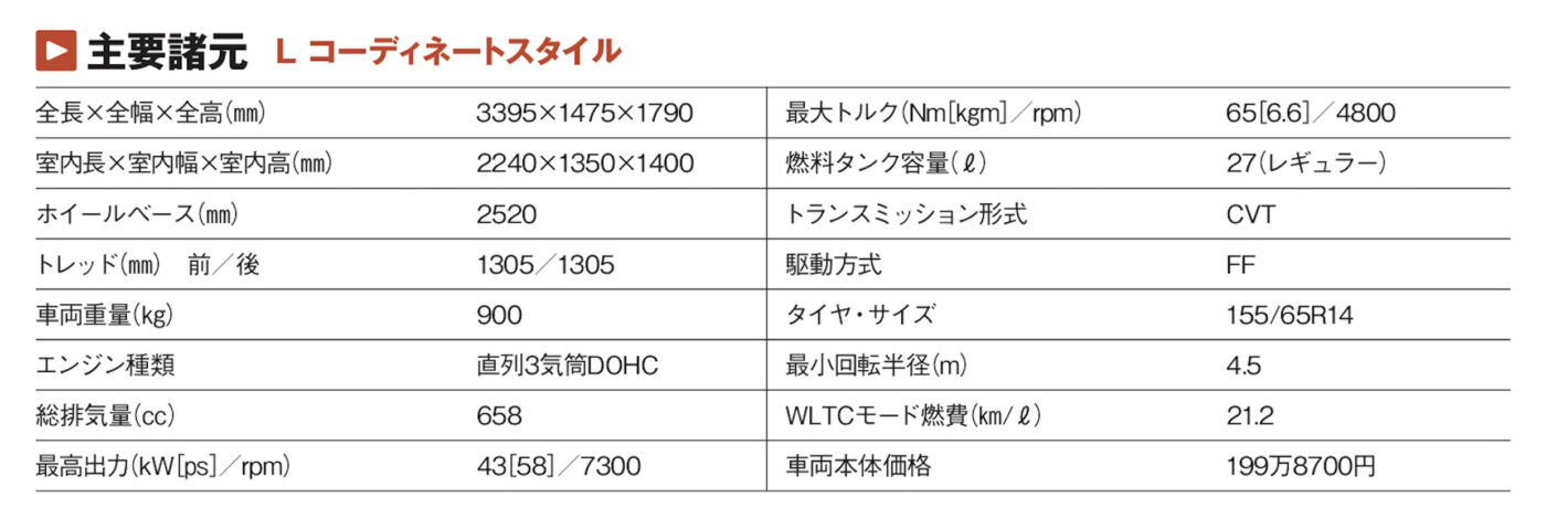 乗り心地も快適だ。足まわりを柔軟に伸縮させ、街なかでもしなやかな印象を受ける。軽自動車としては異例とされるほど防音材を豊富に配置したからノイズも小さい。後席を後方にスライドさせて前席との間隔が大きく開いた状態でも、車内が静かだから普通に会話できる。