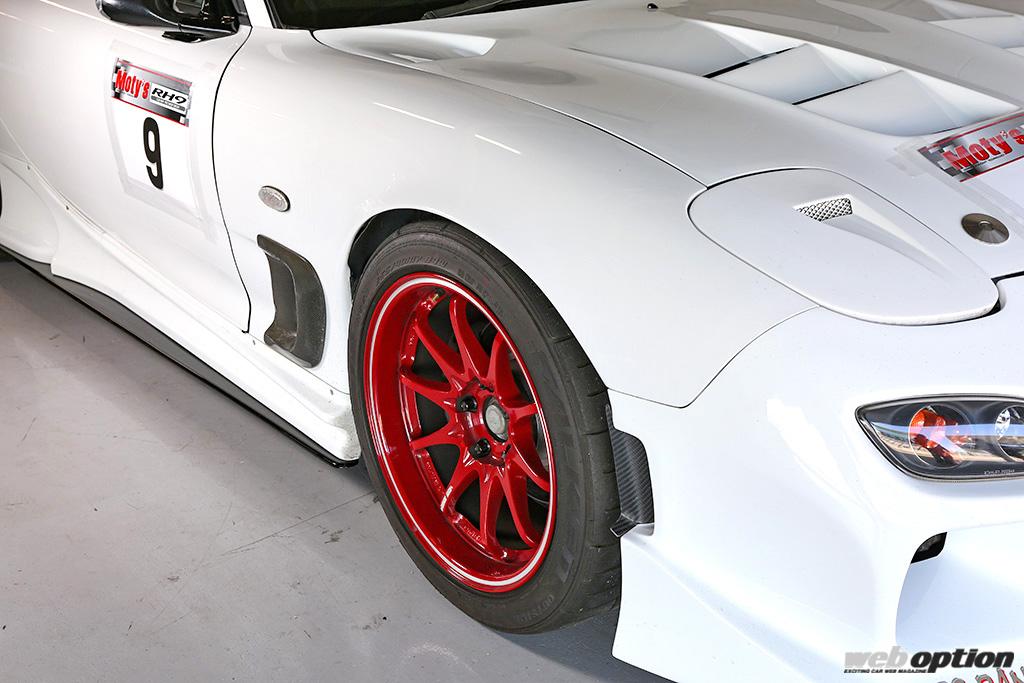 純正ナローボディのまま255サイズのタイヤを装着していることからも分かるように、このチューンドは最小限の手数でFD3Sの持つ魅力を引き出すことを目指して製作された、“RSパンテーラ”のデモカーだ。