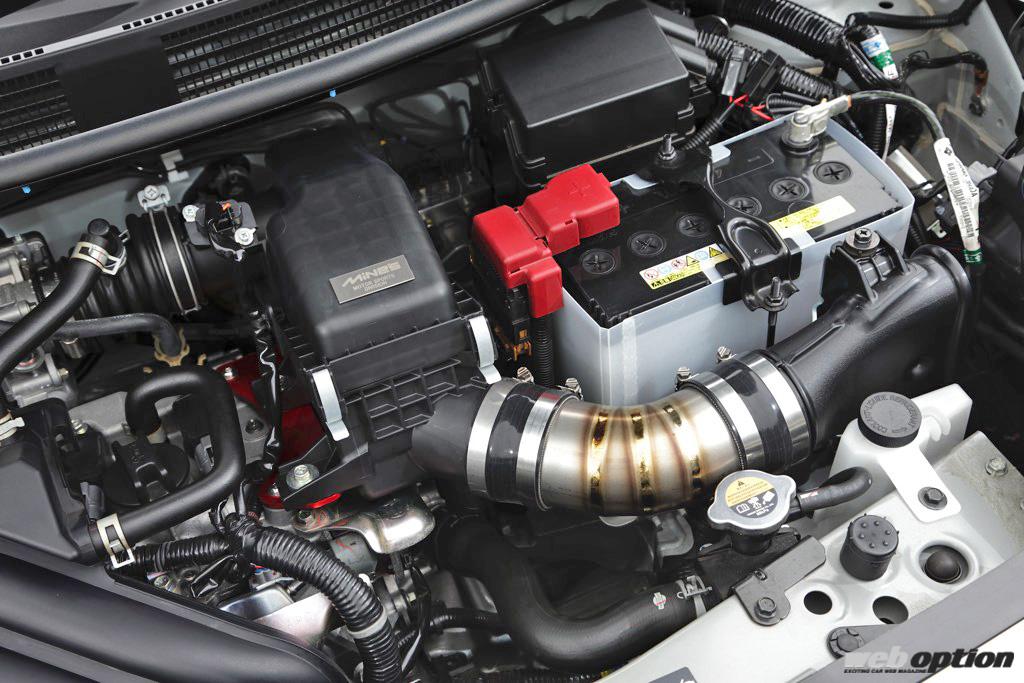 そんなマーチニスモSをパフォーマンスアップさせるべく、マインズが注目したのが吸気系だ。まず、容量が大きいノートニスモS用のエアクリーナーボックスを装着できるコンバージョンキットを用意。フィルターには高効率なK&N製を組み込み、パワー&レスポンスのアップを狙ったのだ。