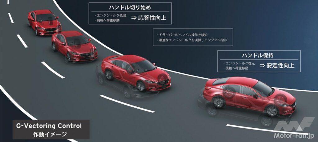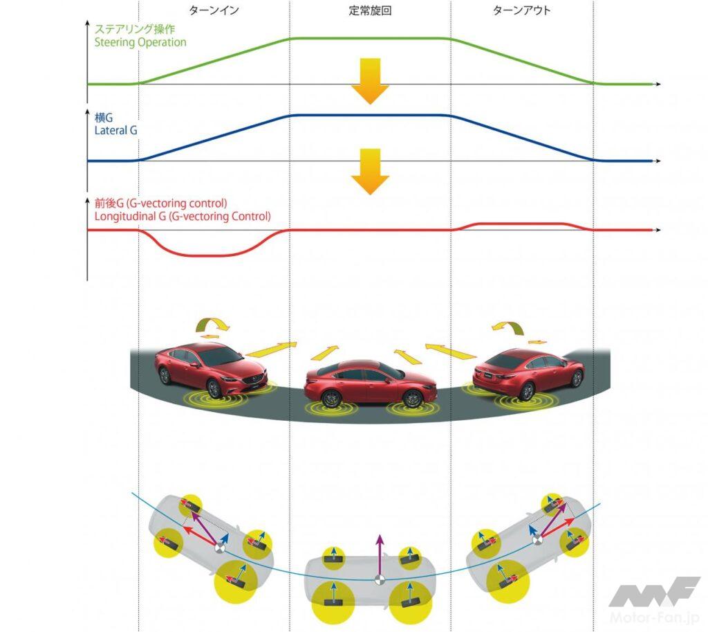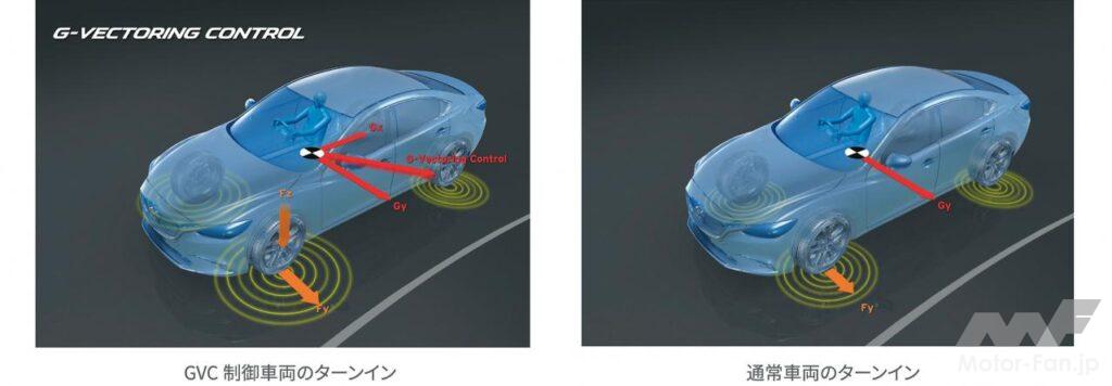 ドライバーはアクセルで前後Gを、ステアリングで横方向のGを制御するが、GVCはエンジンとステアリングを完全に連携して制御することで4輪の接地荷重を瞬間に最適化、前後方向と横方向のGがより滑らかにつながるようにし、旋回応答性と安定性を両立させる。具体的には、ドライバーのステアリング操作に応じてエンジンの駆動トルクを瞬間的に緻密に制御する。制御周期は5ミリ秒。つまり1000分の5秒毎にトルク量を微妙に上下させることで4輪の接地荷重を最適化し、スムーズな車両の挙動を実現するわけだ。