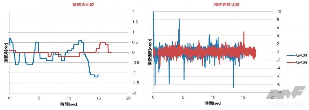実際に変化する加速度は最大で0.05G、通常で0.01Gとエンジンブレーキより断然小さい微少なG変化である。エンジン出力で数Nm、荷重で1輪あたり数kgというごく微少な領域だ。この程度で効果があるのか?という疑問は試乗で氷解した。緊急回避のシングルレーンチェンジでは明確に効果が体感できた。それ以上に印象的だったのは、意識せずに運転操作をしている20km/hという低速時やごく普通の直線を走っているときの修正舵、舵角の少なさだ(これはデータで確認して驚いた)。