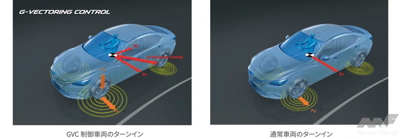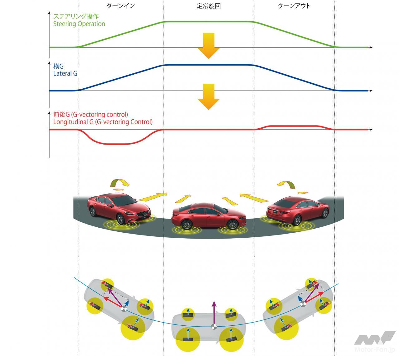 ドライバーはアクセルで前後Gを、ステアリングで横方向のGを制御するが、GVCはエンジンとステアリングを完全に連携して制御することで4輪の接地荷重を瞬間に最適化、前後方向と横方向のGがより滑らかにつながるようにし、旋回応答性と安定性を両立させる。具体的には、ドライバーのステアリング操作に応じてエンジンの駆動トルクを瞬間的に緻密に制御する。制御周期は5ミリ秒。つまり1000分の5秒毎にトルク量を微妙に上下させることで4輪の接地荷重を最適化し、スムーズな車両の挙動を実現するわけだ。