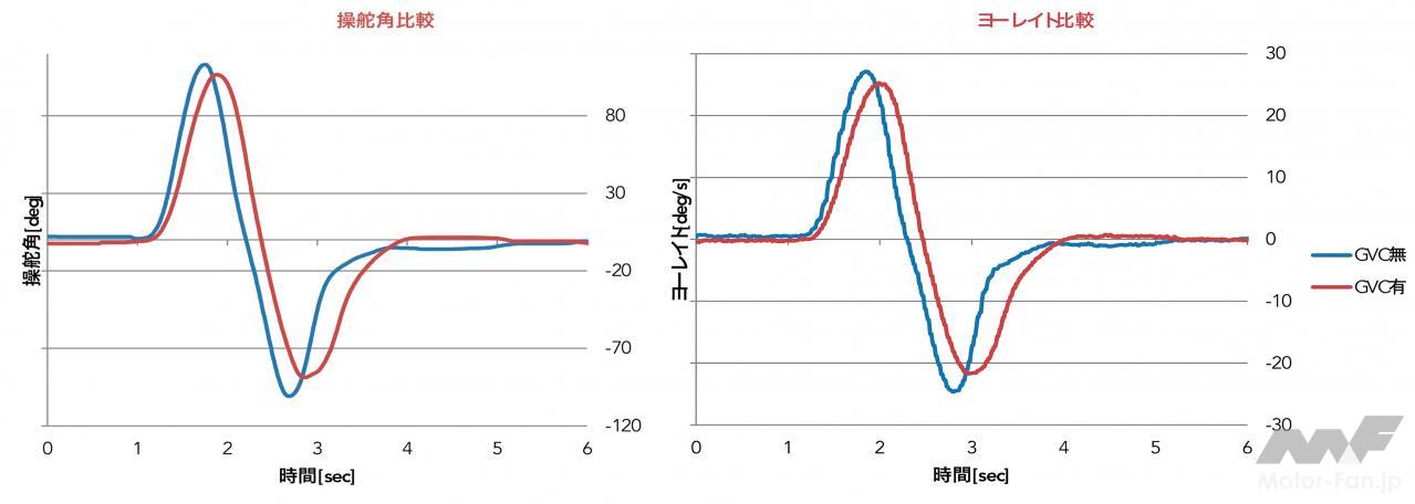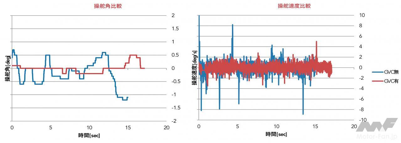 実際に変化する加速度は最大で0.05G、通常で0.01Gとエンジンブレーキより断然小さい微少なG変化である。エンジン出力で数Nm、荷重で1輪あたり数kgというごく微少な領域だ。この程度で効果があるのか?という疑問は試乗で氷解した。緊急回避のシングルレーンチェンジでは明確に効果が体感できた。それ以上に印象的だったのは、意識せずに運転操作をしている20km/hという低速時やごく普通の直線を走っているときの修正舵、舵角の少なさだ(これはデータで確認して驚いた)。