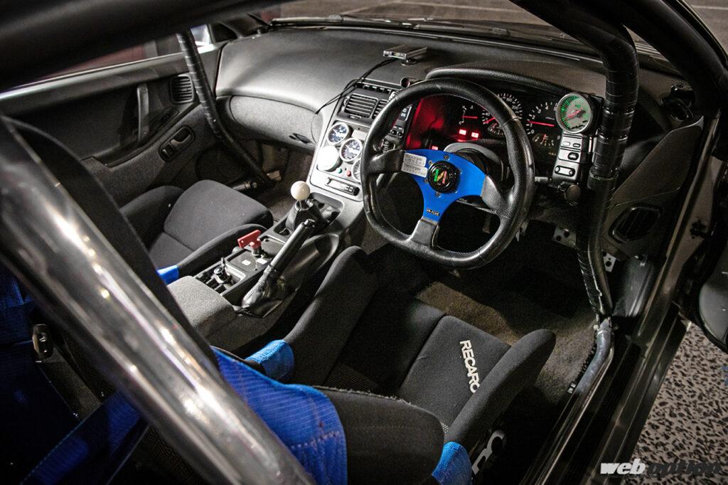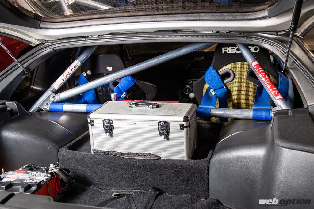 HKSの60φメーターが並ぶスパルタンなコクピット。メーターは欧州仕様の280km/h仕様へと交換されている。ロールケージはクロモリ&ジュラルミンの11点式を装着し、剛性&乗員保護性能を確保。トランクにはエンジンルームより移設した軽量ドライバッテリーが搭載されている。