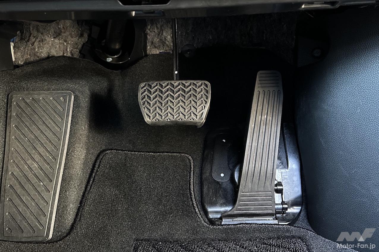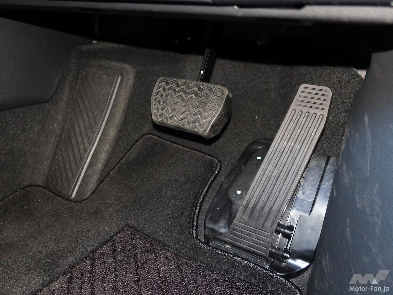 電気自動車のbZ4Xでオルガン式のアクセルペダルを採用しており、これがプリウスでも使えると確認できた段階で、オルガン式ペダルを前提に応答性の作り込みを行なったそう。従来の吊り下げ式ペダルのストロークは38mmだったのに対し、新型プリウスのオルガン式は30mm。ストロークは短くなっているが、吊り下げ式のようにフワフワ動かず、剛性感のある動きをするのでストローク(アクセル開度)の調節がしやすい。短い定常ストロークで応答性が高くなっているだけでなく、剛性感のある踏み心地を実現した点が、新型プリウスが採用したオルガン式アクセルペダルの特徴だ。