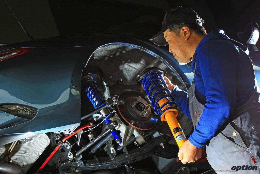 バネレートは、フロント2.26kg/mm&リヤ1.18kg/mmの純正に対して、ロールを活かしながら限界域の過度なロールを抑制。ローダウンしてもバンプタッチしないレート設定として、フロント3.3kg/mm&リヤ2.2kg/mmを導き出した。