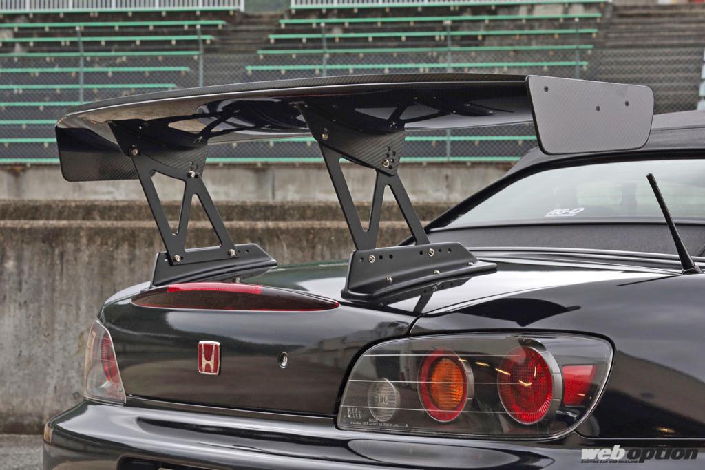 車検対応の1400mm幅ながらリヤの安定感を高めるGTウイングは、ストリートでのスタイリングに配慮して小ぶりな翼端板を採用。タイプS純正トランク用マウントが用意されているので、タイプSなら無加工で装着することが可能だ。