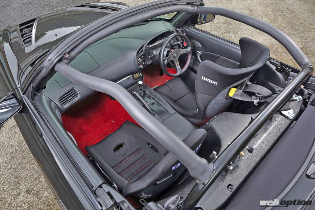 室内はストリート仕様そのもの。ドライバーズシートは抜群のホールド性を誇るブリッドのプロフェイスに交換済み。また、オープンカーでサーキット走行を行うための必須アイテムであるロールケージも組まれる。