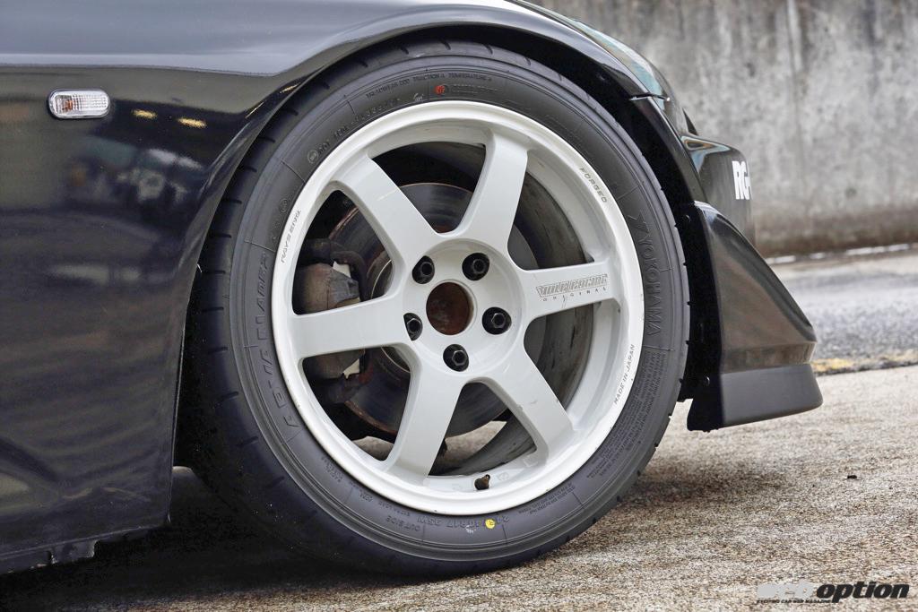 ホイールは軽さと剛性のバランスに優れたボルクレーシングTE37 SAGA(F8.5J-17+52 R9.5J-17+63)で、タイヤにはアドバンA052(F245/40-17 R255/40-17)を組み合わせる。