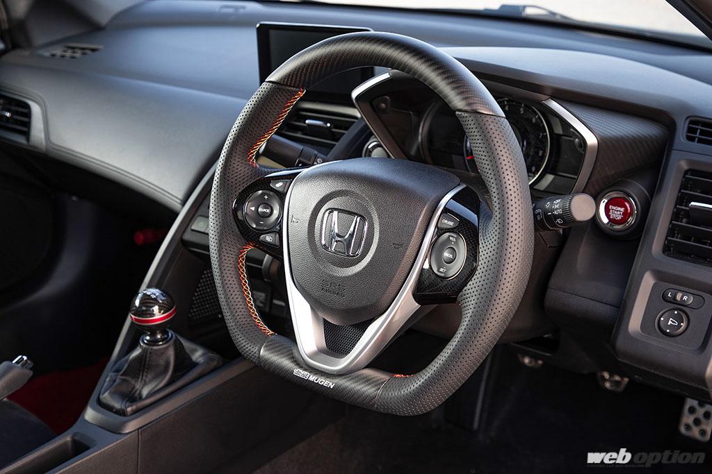 取材車両にはスポーツ走行に最適化したクイックシフターと、アルミにドライカーボンを積層させたシフトノブを装着。ステッチに無限のコーポレートカラーが与えられたステアリングも無限の製品だ。