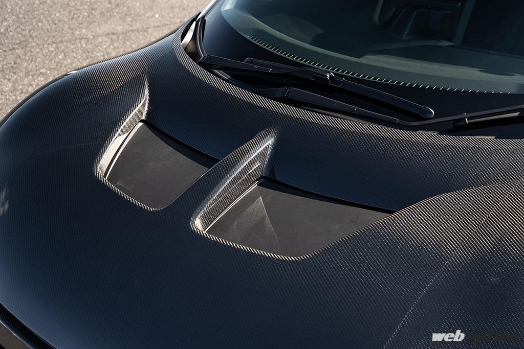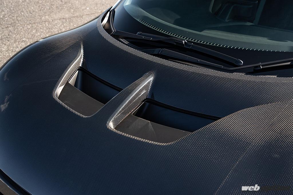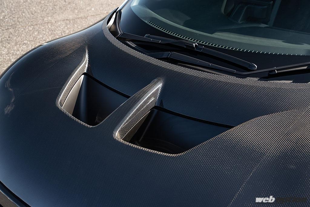 エアロボンネットは、デザイン面でも迫力ある大型のクーリングダクトを設けたデザイン。表面をドライカーボン、裏面をFRPとすることでコストも抑えられている。トランク内のダクトはクイックリリースで簡単に脱着できるのも魅力だ。