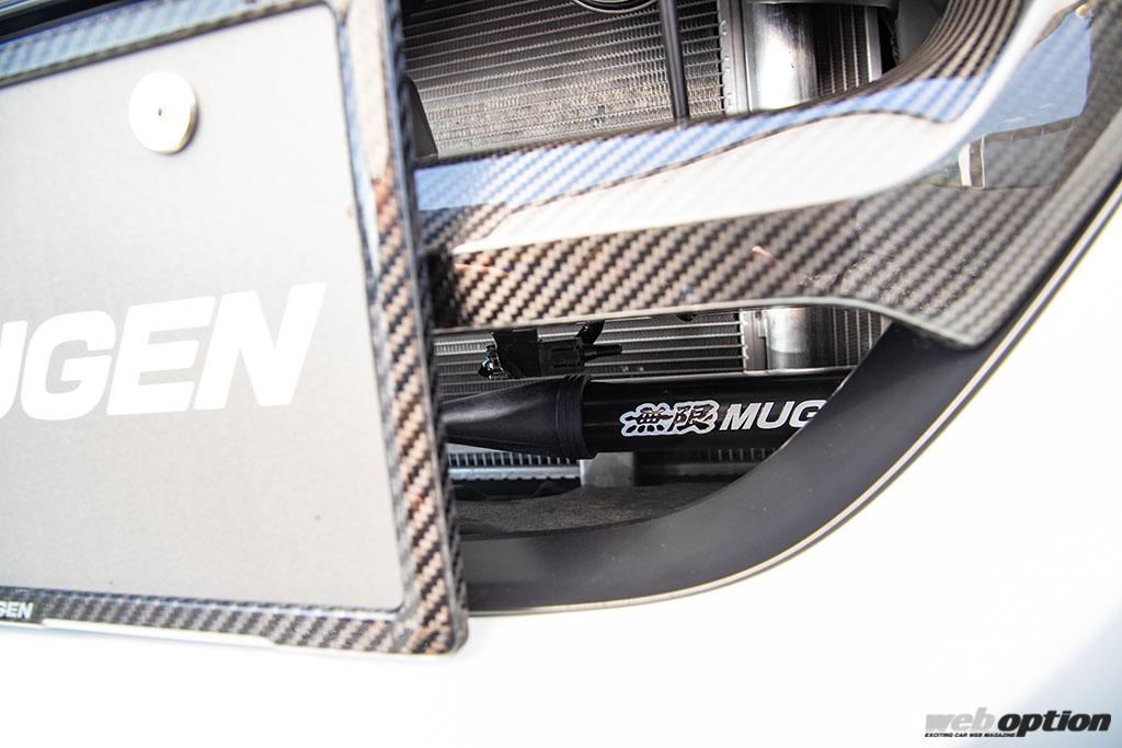 バンパー奥に見えるのは、走行中に発生する不快な微振動や騒音を解消し、上質な乗り心地と操縦安定性向上を実現するパフォーマンスダンパー。純正サスはもちろん、無限サスやホイールまで対応のセッティングだ。