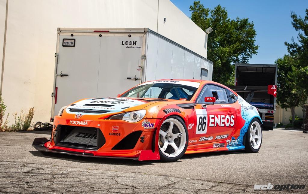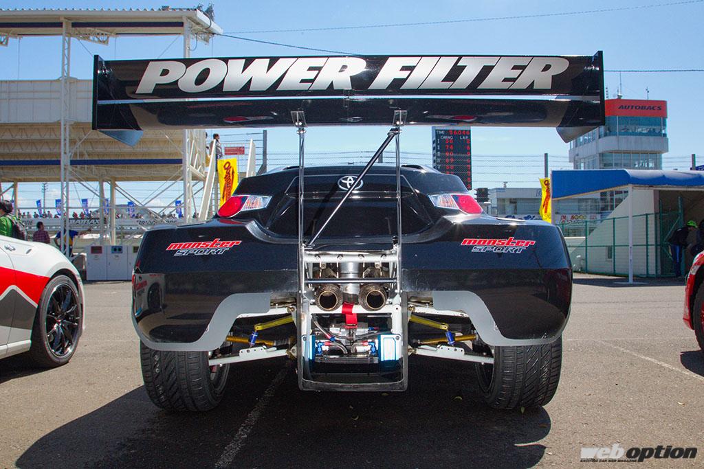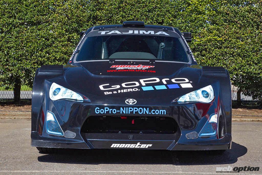RCカーのバギーを彷彿させるルックスは、トヨタ86のイメージをシッカリと再現。悪路でも車体を押さえつけるために、2枚板タイプのバーチカルGTウイングも特大サイズが投入されている。