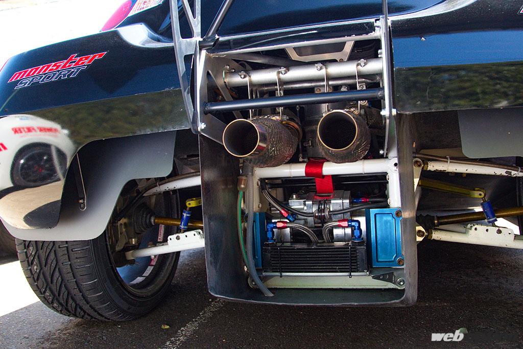 センター2本出しのマフラーが只者ならぬ雰囲気を醸し出すリヤセクション。エンジンや駆動系などのクーリング対策もキッチリと行われ、安定した走りを実現する。