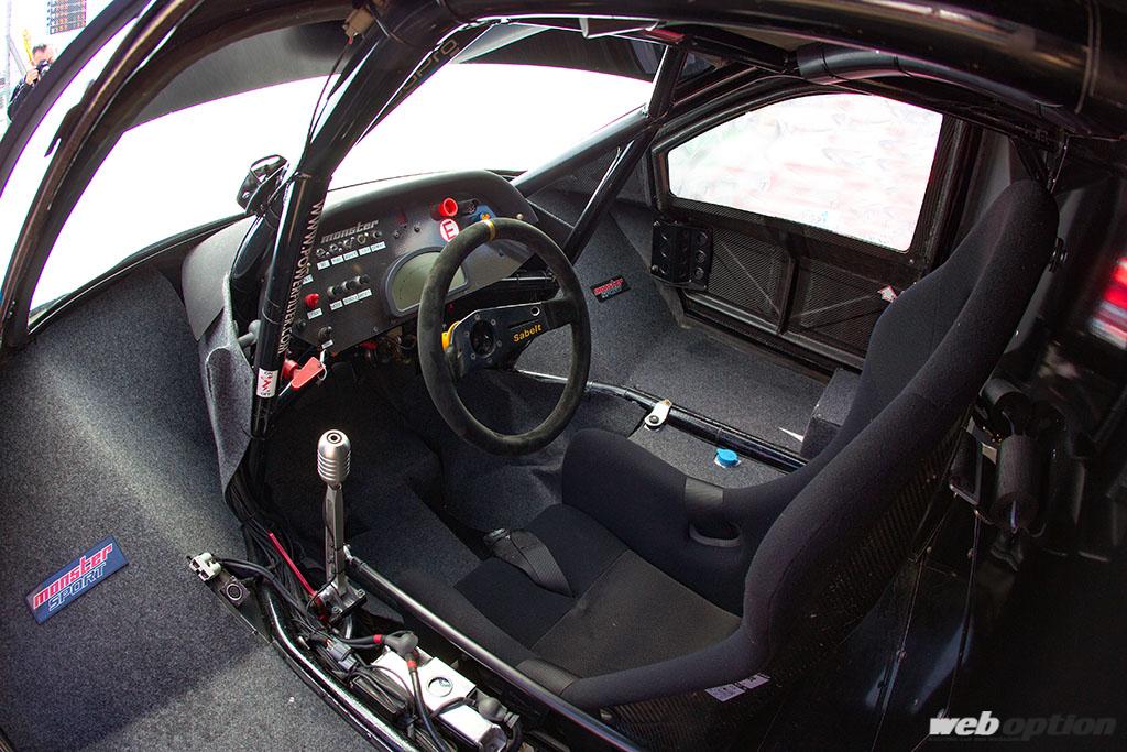 コクピットは、中央にバケットシートが鎮座する衝撃のセンターハンドル仕様。ワンオフのメーターパネルやドアはドライカーボン製で、モーテックのデータロガーも搭載されている。しっかりと内装を作り込んでいるところにモンスターの拘りが感じられる。