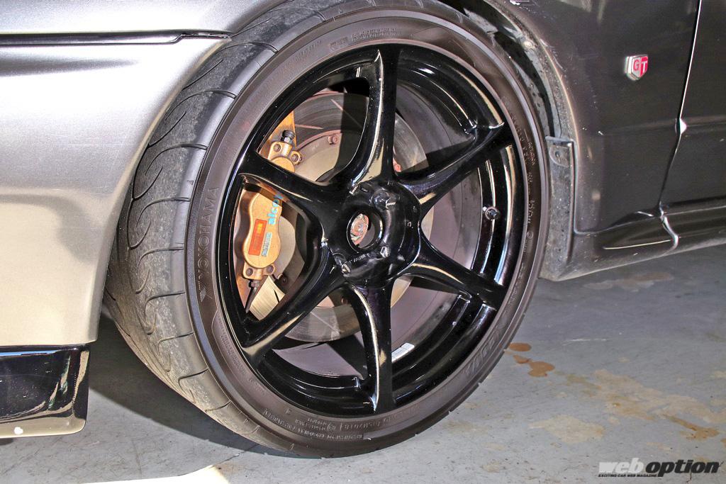 ホイールはBNR34純正をブラックに塗装して装着。外観ノーマル風というオーナーの拘りにもピッタリはまっている。タイヤはアドバンネオバAD08Rをチョイスしている。