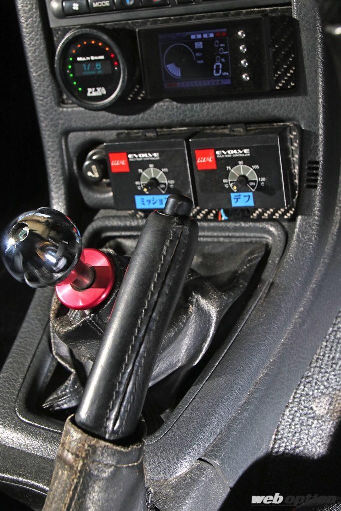 ミッションはOS技研の6速シーケンシャルを装着。その他、駆動系は前後デフがOS技研、トランスファーも強化している。シフト前にはミッションとデフクーラーのポンプ駆動コントローラーが並ぶ。